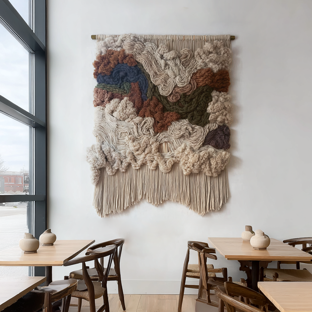 Bring warmth, texture, and artistry into your home with this handmade abstract fiber wall art. Crafted from high-quality wool and yarn, this large woven tapestry features a rich mix of earthy tones — terracotta, beige, olive green, navy, cream, and rust — creating a harmonious flow of colors and textures.