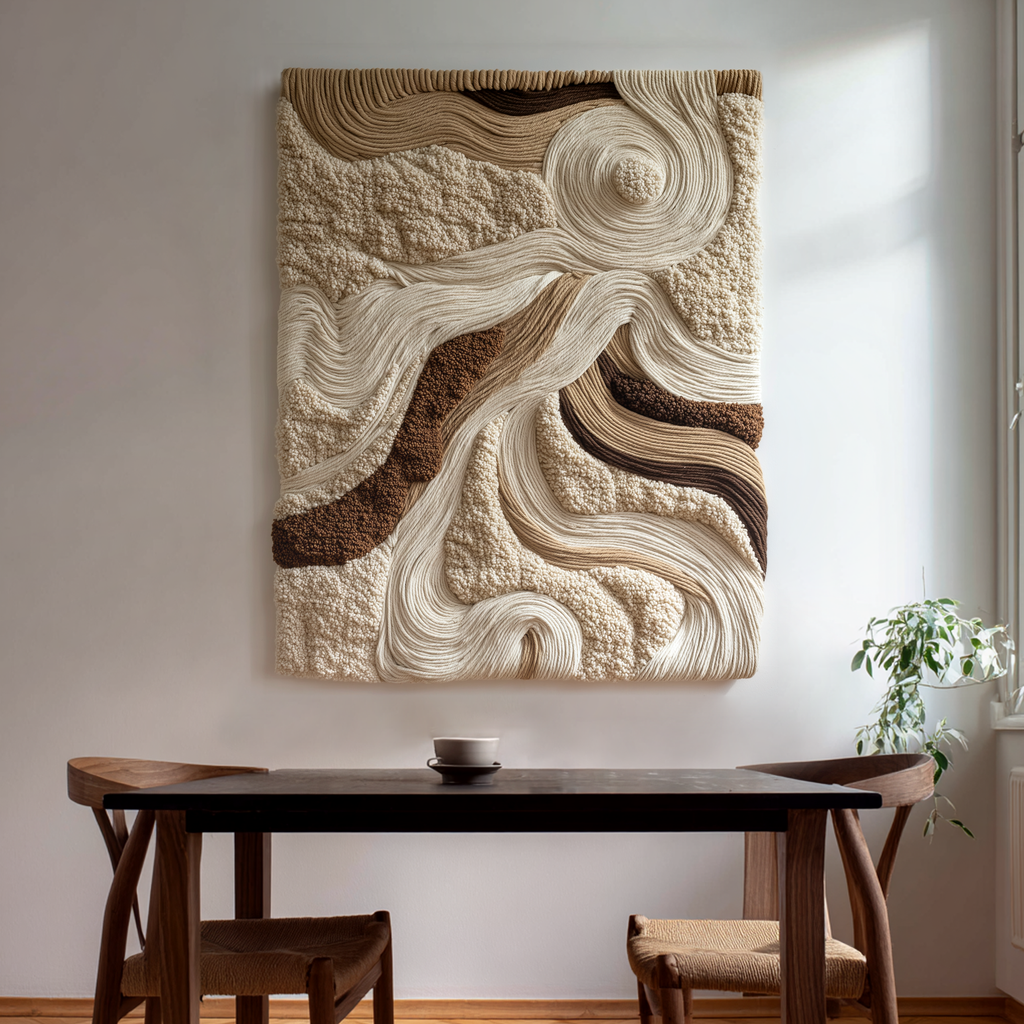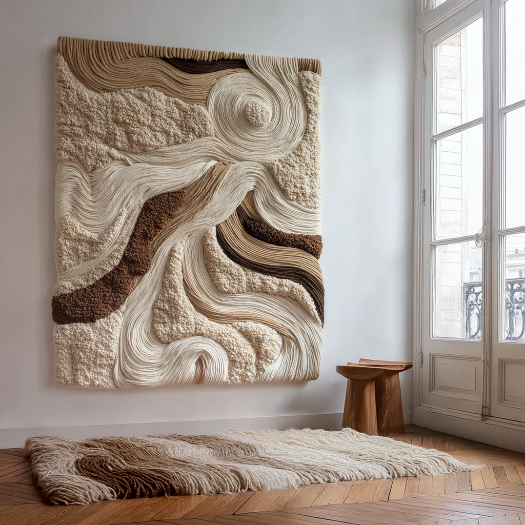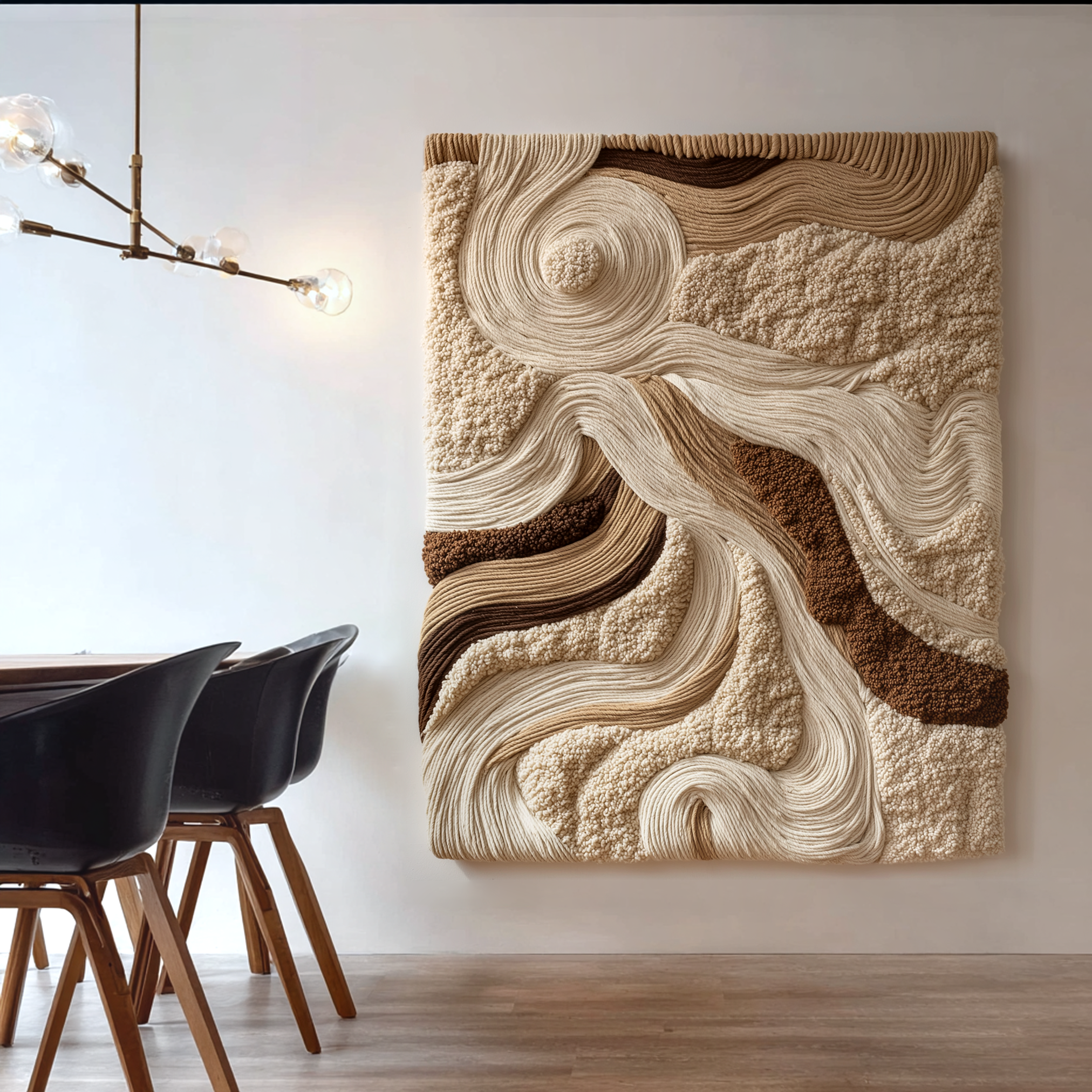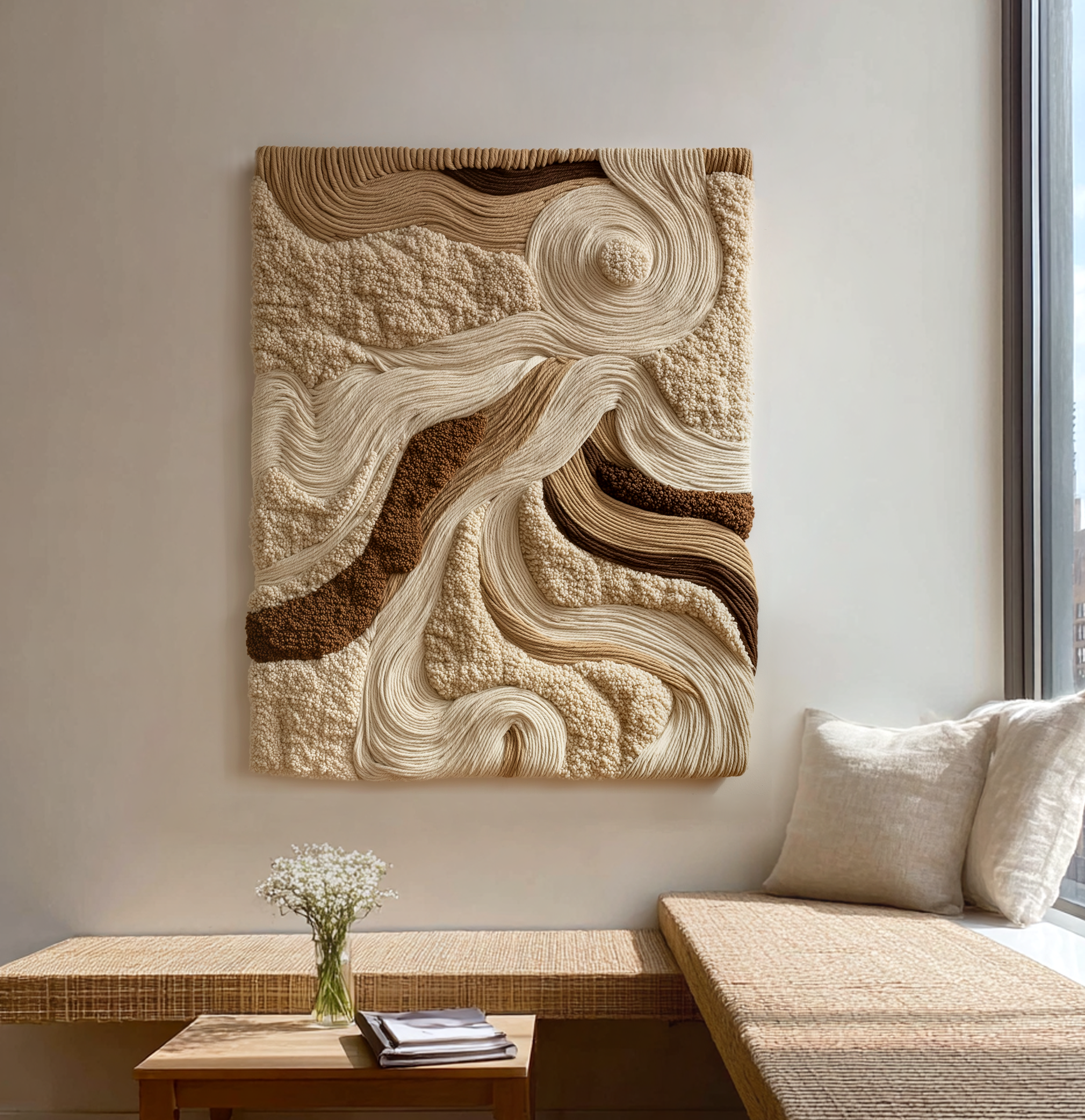 Crafted with neutral beige, cream, and brown yarns, the layered waves and textured patterns create a sense of calm movement, perfect for living rooms, bedrooms, entryways, or office walls. Its earthy modern aesthetic makes it an ideal choice for Scandinavian interiors, Japandi style, or cozy boho chic homes.