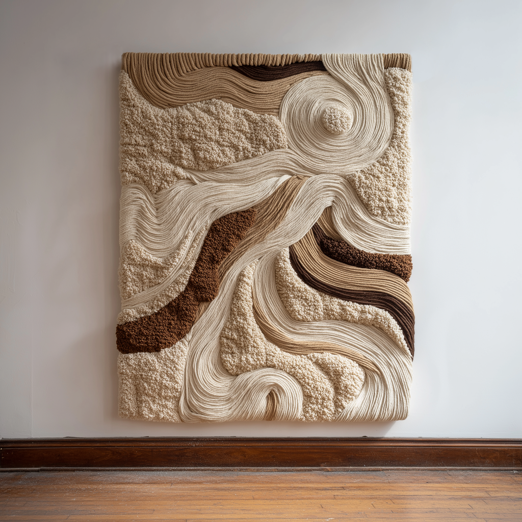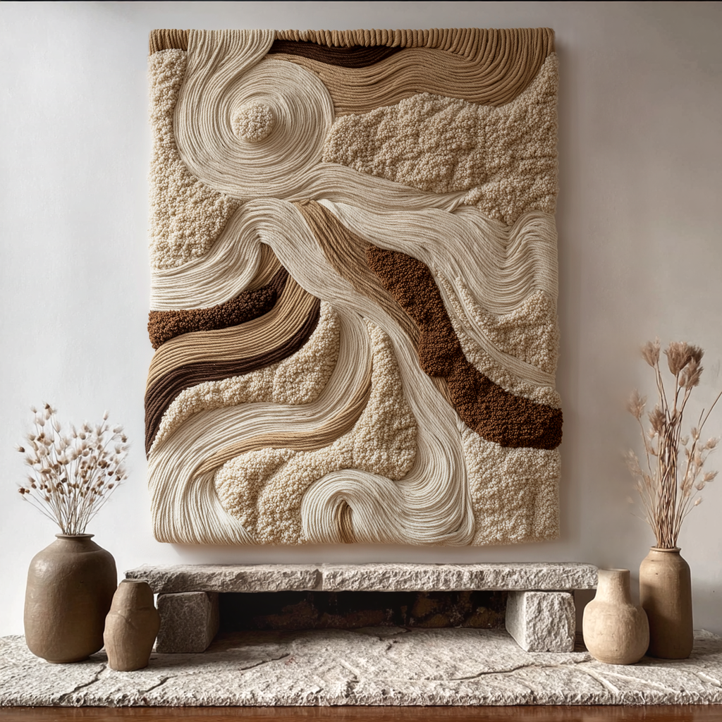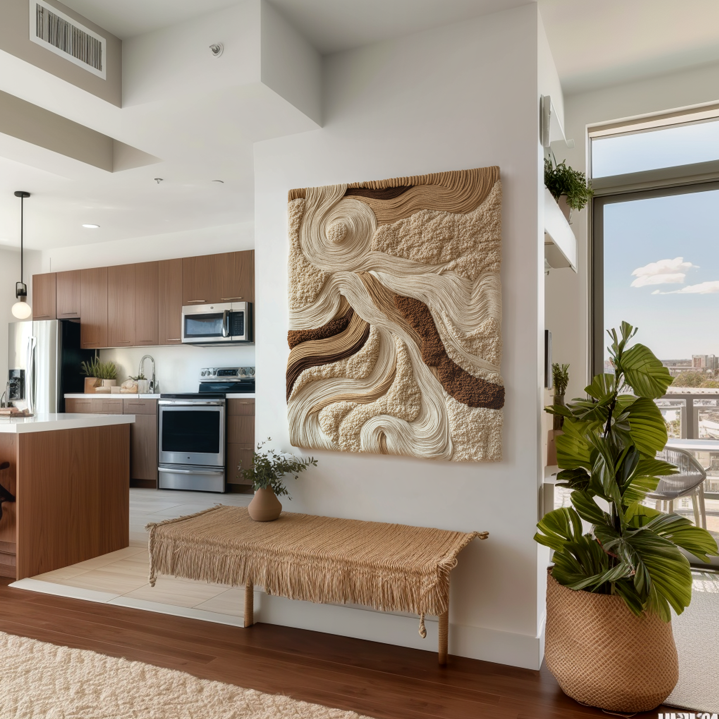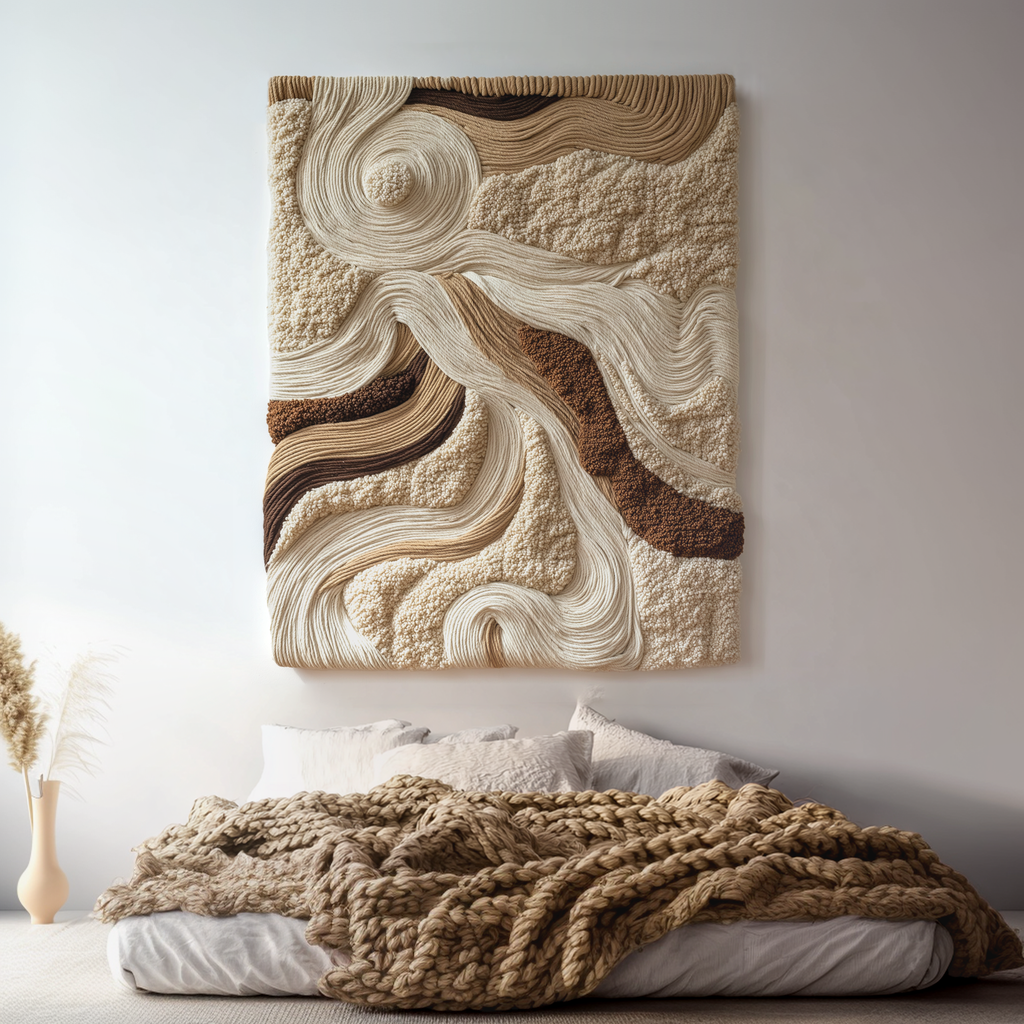 Crafted with neutral beige, cream, and brown yarns, the layered waves and textured patterns create a sense of calm movement, perfect for living rooms, bedrooms, entryways, or office walls. Its earthy modern aesthetic makes it an ideal choice for Scandinavian interiors, Japandi style, or cozy boho chic homes.