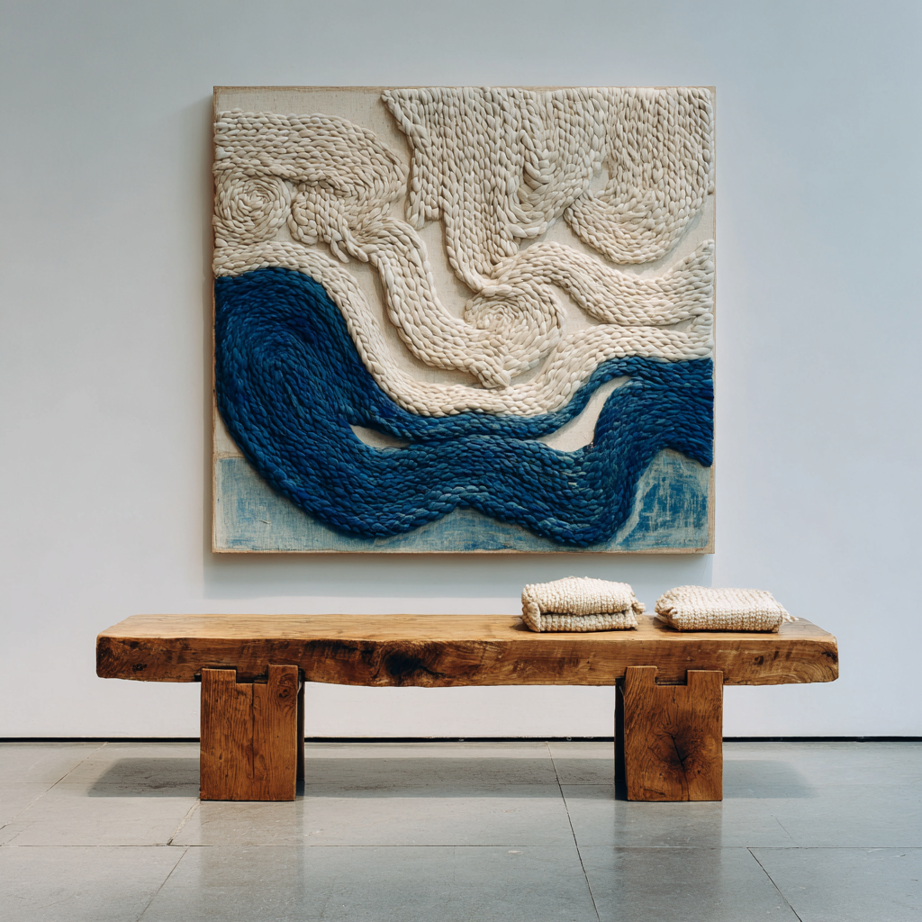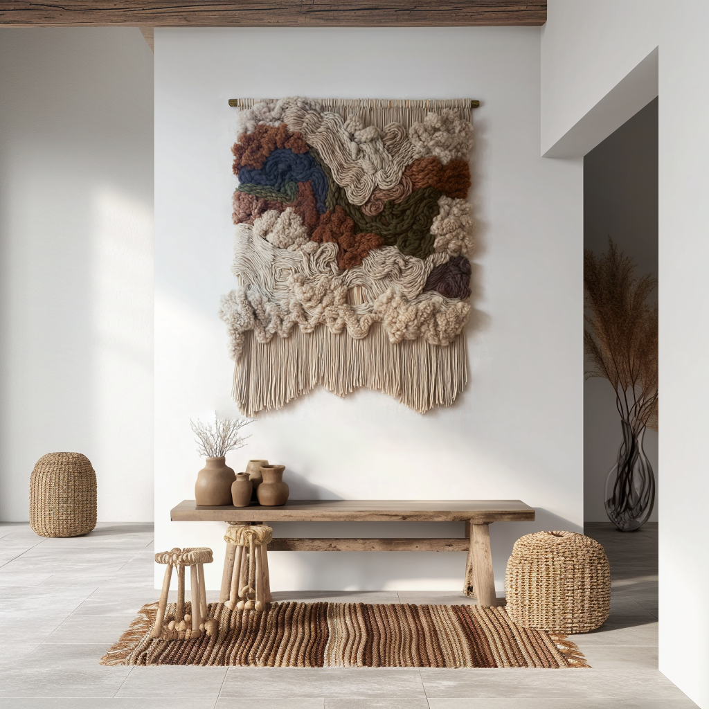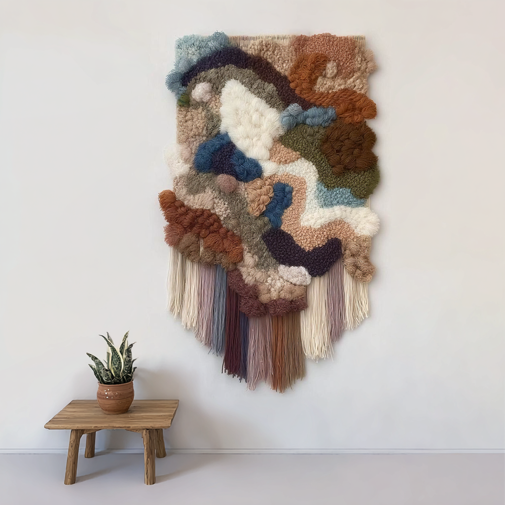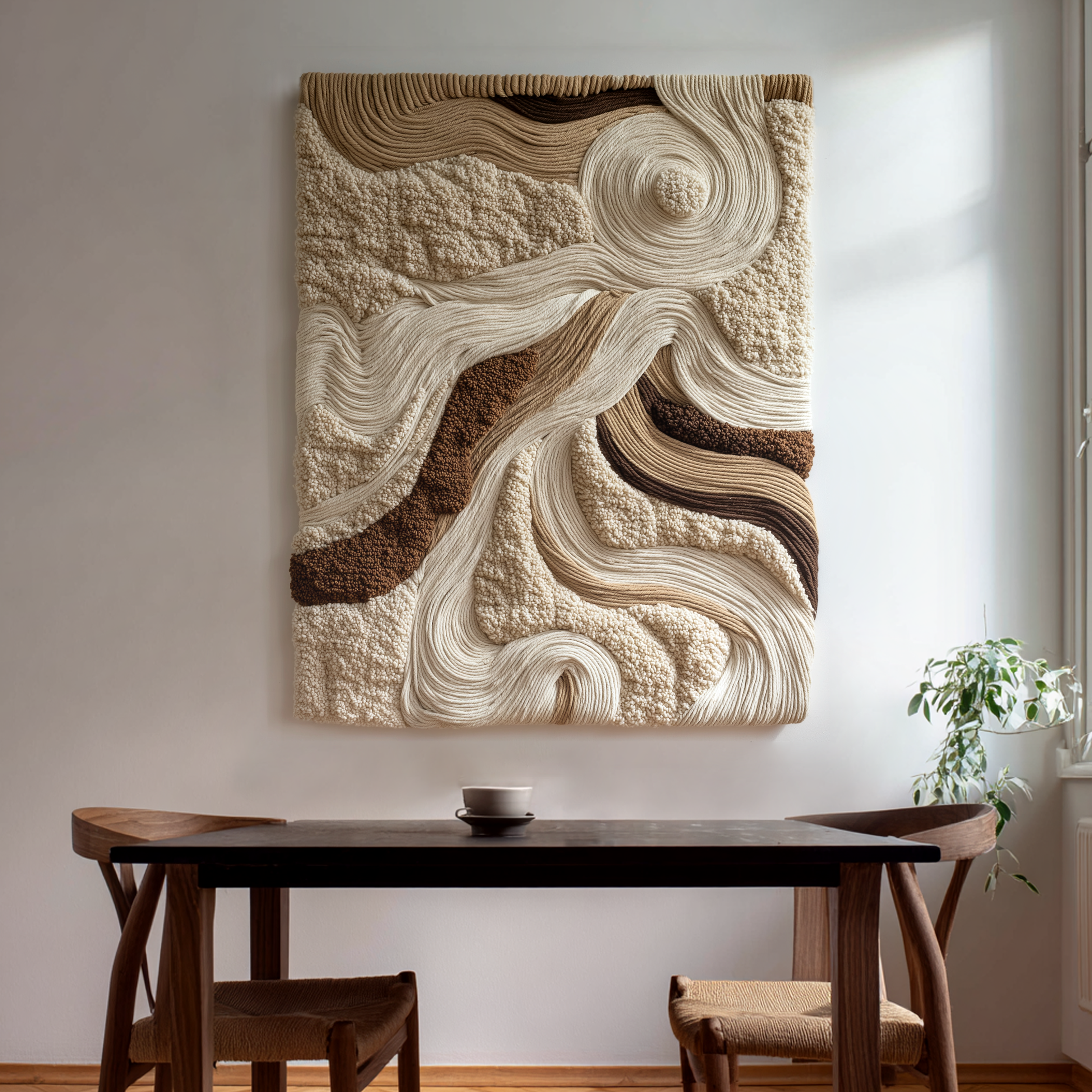 Crafted with neutral beige, cream, and brown yarns, the layered waves and textured patterns create a sense of calm movement, perfect for living rooms, bedrooms, entryways, or office walls. Its earthy modern aesthetic makes it an ideal choice for Scandinavian interiors, Japandi style, or cozy boho chic homes.